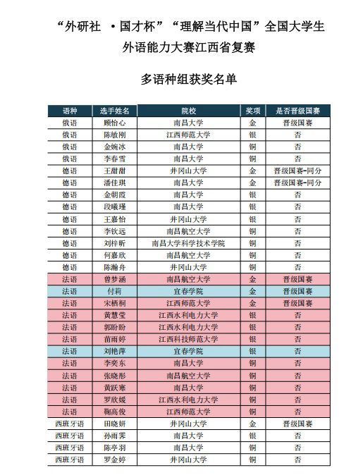 本站讯(外国语学院 曾利霞 谢丽梅)近日,2025“外研社·国才杯”“理解当代中国”全国大学生外语能力大赛江西省复赛(多语种组)圆满落幕。在全省众多参赛选手的激烈角逐中(本次江西赛区共设3金、4银、5铜),我院学子表现亮眼、脱颖而出:23级法语班刘艳萍同学凭借扎实功底斩获银奖,22级法语班付莉同学以全省第二名的优异成绩勇夺金奖,将代表我校晋级全国总决赛。