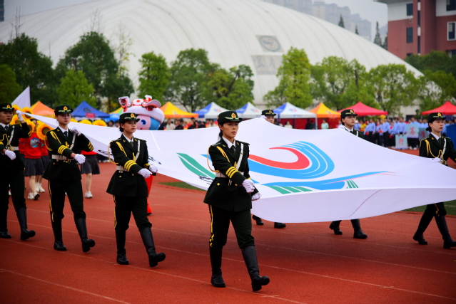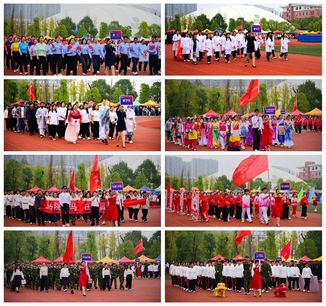 随后,青年志愿者方阵满怀热忱入场,志愿服像燃烧的火炬,是他们奉献精神的写照;裁判员方阵着装统一,神情肃穆,彰显公正执裁的专业风范;教职工方阵步伐稳健,尽显师者气度;研究生方阵意气风发,传递着学术与运动兼具的活力;各教学院方阵创意迭出——国际教育学院学子身着汉服,尽显文化交融之美;外国语学院演绎“革命战士”与军训学生跨时空相遇,发出“正义必胜、和平必胜”的宣言;经济与管理学院学子动作明快且富有韵律,将传统民俗元素与现代表演形式巧妙融合;生命科学与资源环境学院在金色麦浪中洋溢着丰收的喜悦......各方阵嘹亮口号此起彼伏,赢得现场观众阵阵掌声。