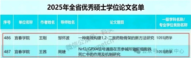 本站讯(药学院 供稿)根据江西省人民政府学位委员会办公室《关于开展2025年全省优秀博士硕士学位论文评选工作的通知》(赣学位办〔2025〕3号)要求,省学位办组织开展了2025年全省优秀博士、硕士学位论文评选工作。经各研究生培养单位推荐,省学位办组织专家通讯评议,共评选出优秀博士学位论文80篇,优秀硕士学位论文487篇。其中,宜春学院药学院2篇硕士学位论文获评优秀。