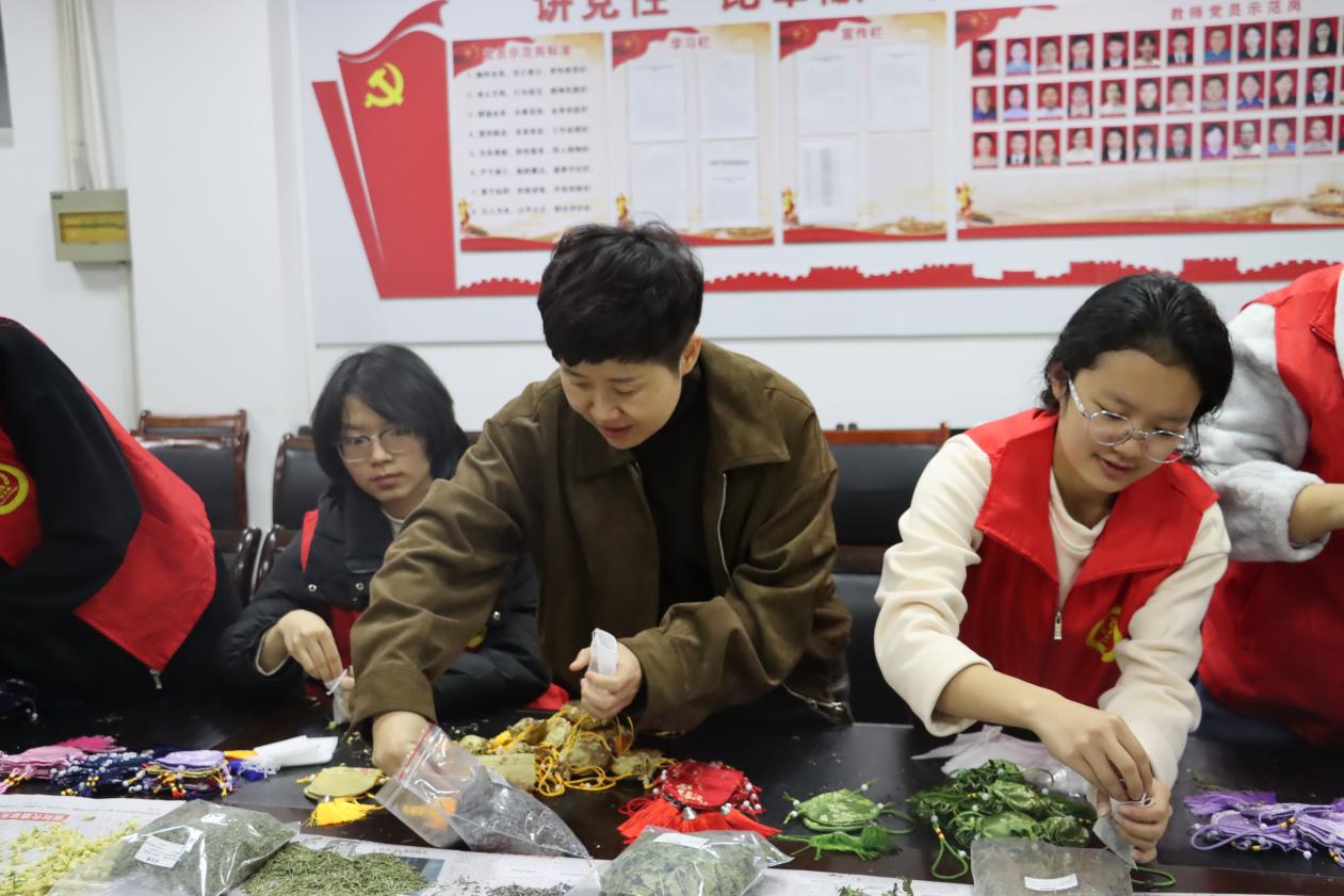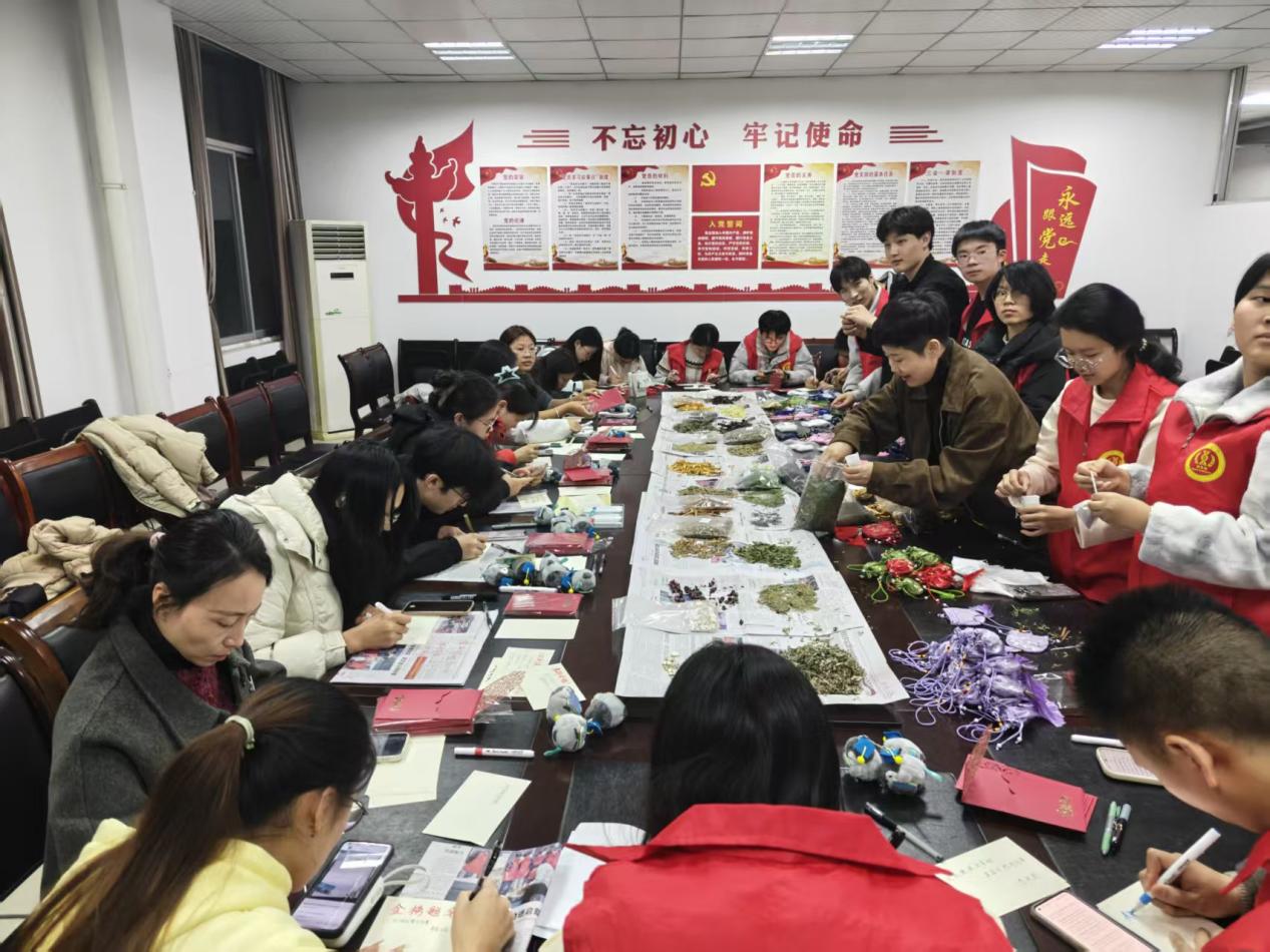 16日晚,药学院二教楼的药学院会议室灯火通明,暖意交织。为了让备考学子在高强度复习中舒缓压力、安心入眠,学院充分发挥专业育人优势,依托中草药学社精选艾草、薰衣草、合欢花等兼具安神解郁功效的中草药。师生们围坐成圈,指尖翻飞间,将晒干的草药细心分拣、称量、装填,一个个饱满的香囊在掌心逐渐成形——这不是简单的手工劳作,而是药院人用专业知识打磨的“安心符”,每一缕药香都凝结着对学子身心健康的牵挂。