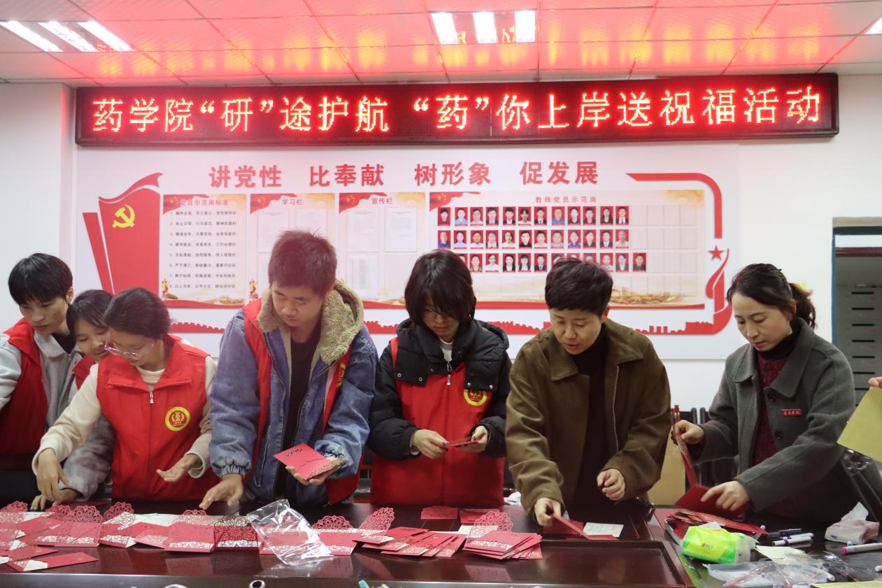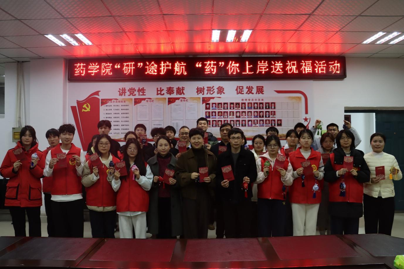 本站讯(学生通讯员 刘慧敏 陈心如 晏宇豪 陈佳伟)冬夜渐寒,研途正酣。12月16日至17日,一场以“‘研’途护航,‘药’你上岸”为主题的考研送祝福活动温情上演。学院党委书记王霏、院党委副书记陶华蕾、副院长张兵锋、院务委员张昌源,学生工作办公室(团委)主任梁骏楷,专职辅导员彭青、甘淑芳、杨权,蓝雪莲,毕业班辅导员及部分专业负责人、教研室主任共同参与活动,为考研学子送上最真挚的关怀与祝福。