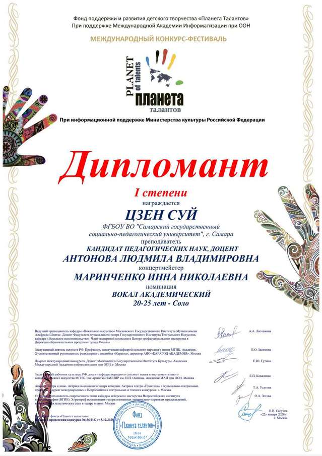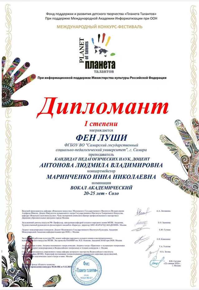 获奖学生分别为中外合作办学项目本科大四学生曾穗(男中音)与项目21级毕业生留俄继续学历深造的硕士一年级学生冯璐诗(女高音)。他们师从萨马拉国立社会与师范大学音乐教育系副教授、教育学博士、全俄及国际比赛获奖者安东诺娃·柳德米拉·弗拉基米罗夫娜,艺术指导为国际比赛获奖者因娜·尼古拉耶夫娜·马林琴科。两位学子的优异成绩,既展现了自身扎实的专业素养与不懈努力,也凝聚了中俄双方教师的悉心培养与辛勤付出。